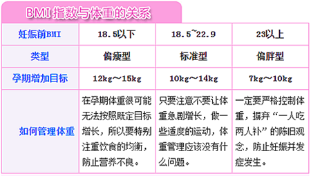 孕前體重標(biāo)準(zhǔn)18.5<BMI <24,孕期增重標(biāo)準(zhǔn)為11-16.5千克;